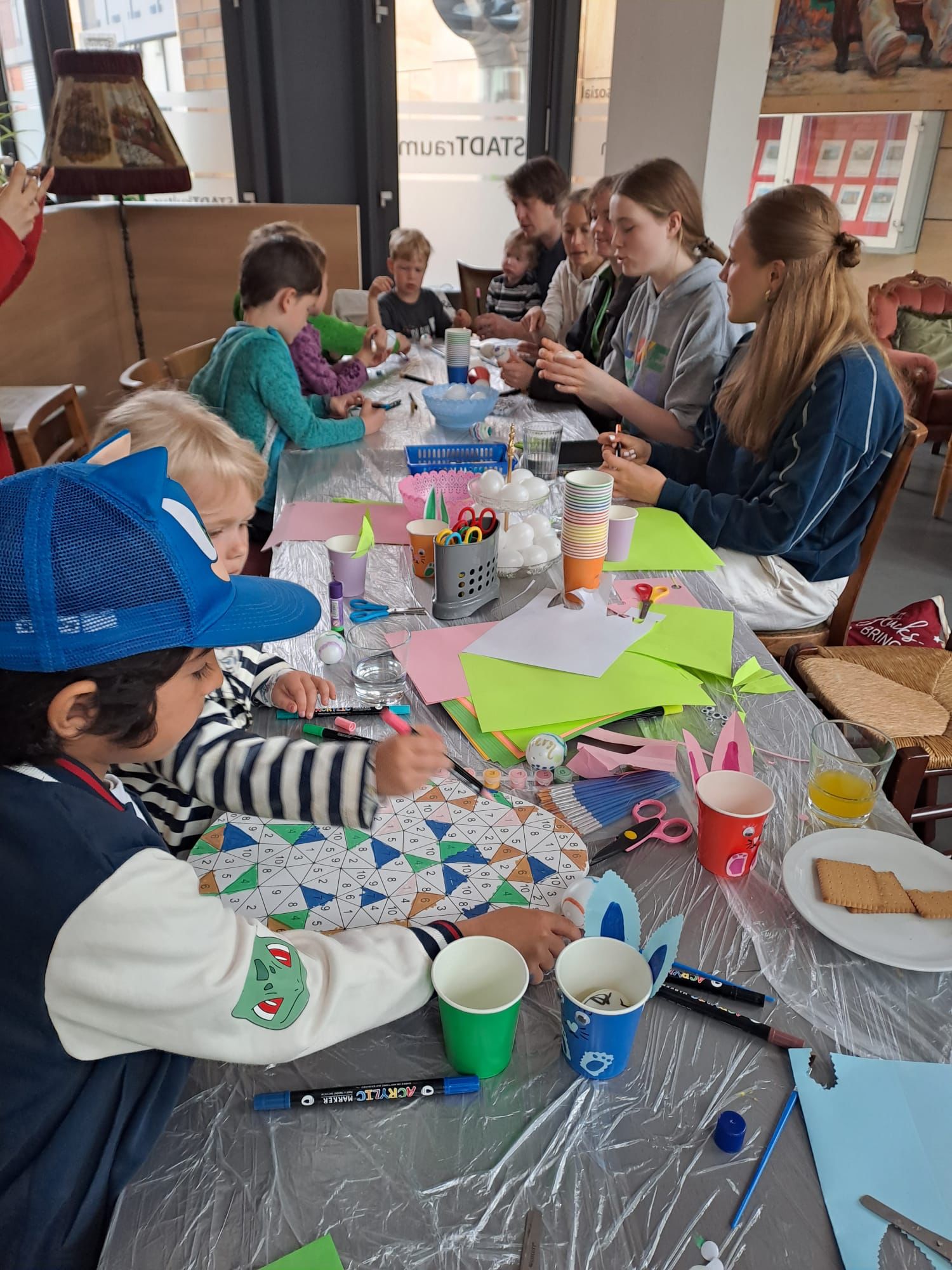 Beim Osterfest für Kinder und Familien wurde gemeinsam gebastelt, gemalt und gelauscht. Die Kinder gestalteten farbenfrohe Osternester, bemalten Eier und hörten aufmerksam einer Ostergeschichte zu. Zum Abschluss suchten sie mit großer Begeisterung nach versteckten Ostereiern in der Blauen Frieda – ein schöner Ausklang für ein gelungenes Fest.